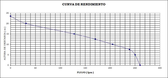 Flujo L/min | Descarga (m) | Presión ( Kg/cm2 ) | Succión (m) | Amperaje | Presión ( Kg/cm2 ) |
